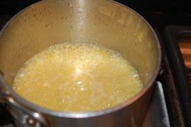 Le vin blanc est réduit par moitié puis le beurre est délicatement incorporé et fouetté à feu très doux (ne pas dépasser la température de 65 degrés) dans une casserole à fond épais.