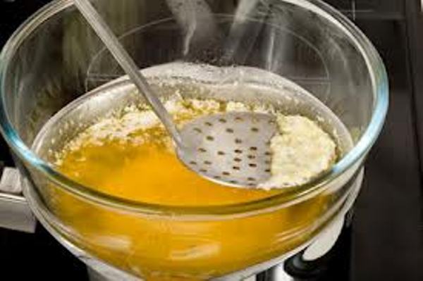 Une fois fondu, les éléments solides flottant en surface (essentiellement la caséine) sont écrémés. Les autres particules solides qui coulent (le petit-lait) sont séparées par filtration.